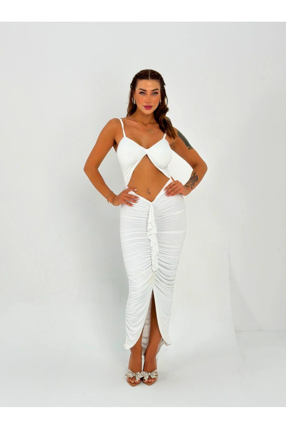 Premium Vücuda Oturan Örme Büzgülü Özel Dekolte Detaylı Abiye Elbise - Beyaz