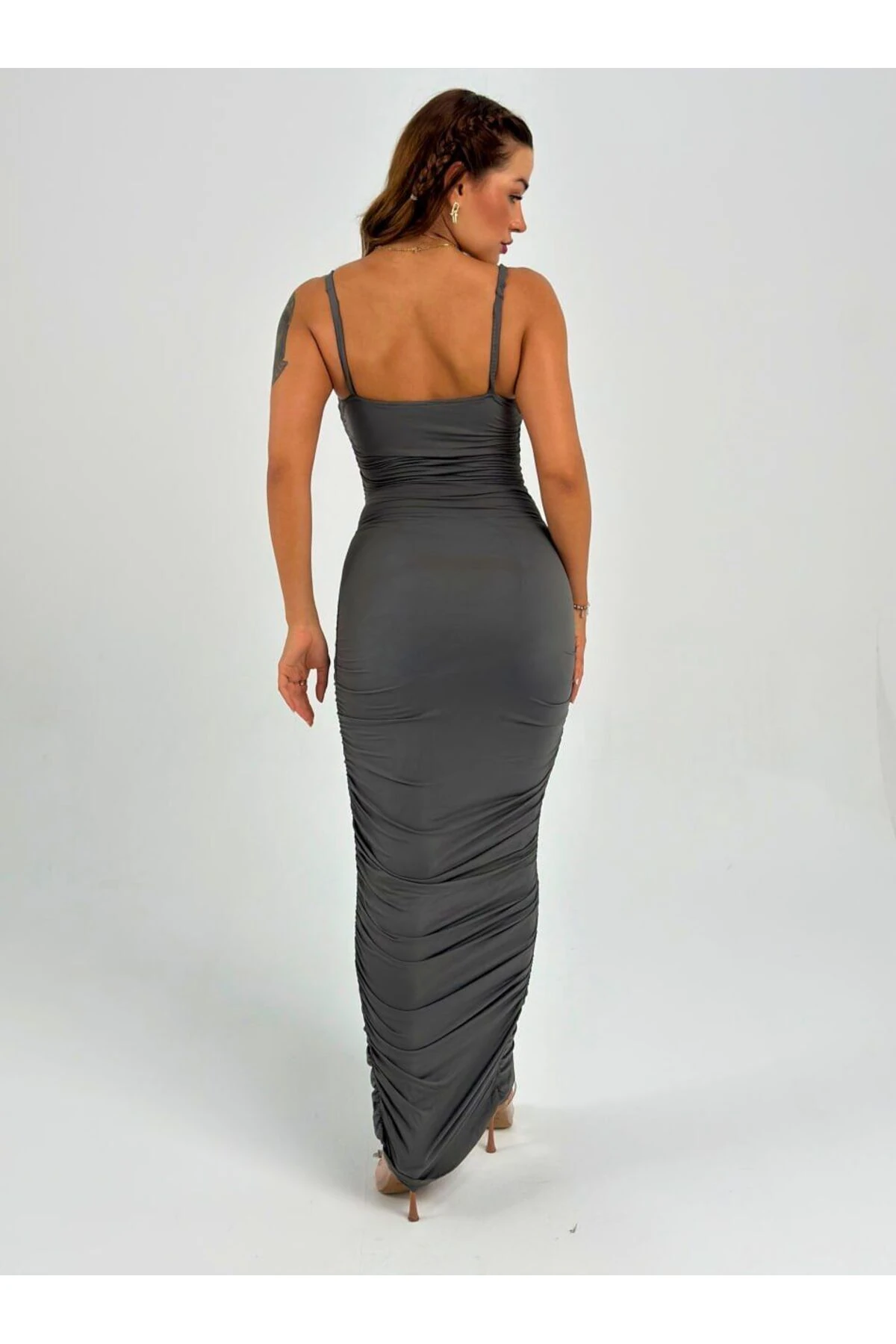 Premium Vücuda Oturan Örme Büzgülü Özel Dekolte Detaylı Abiye Elbise - Haki