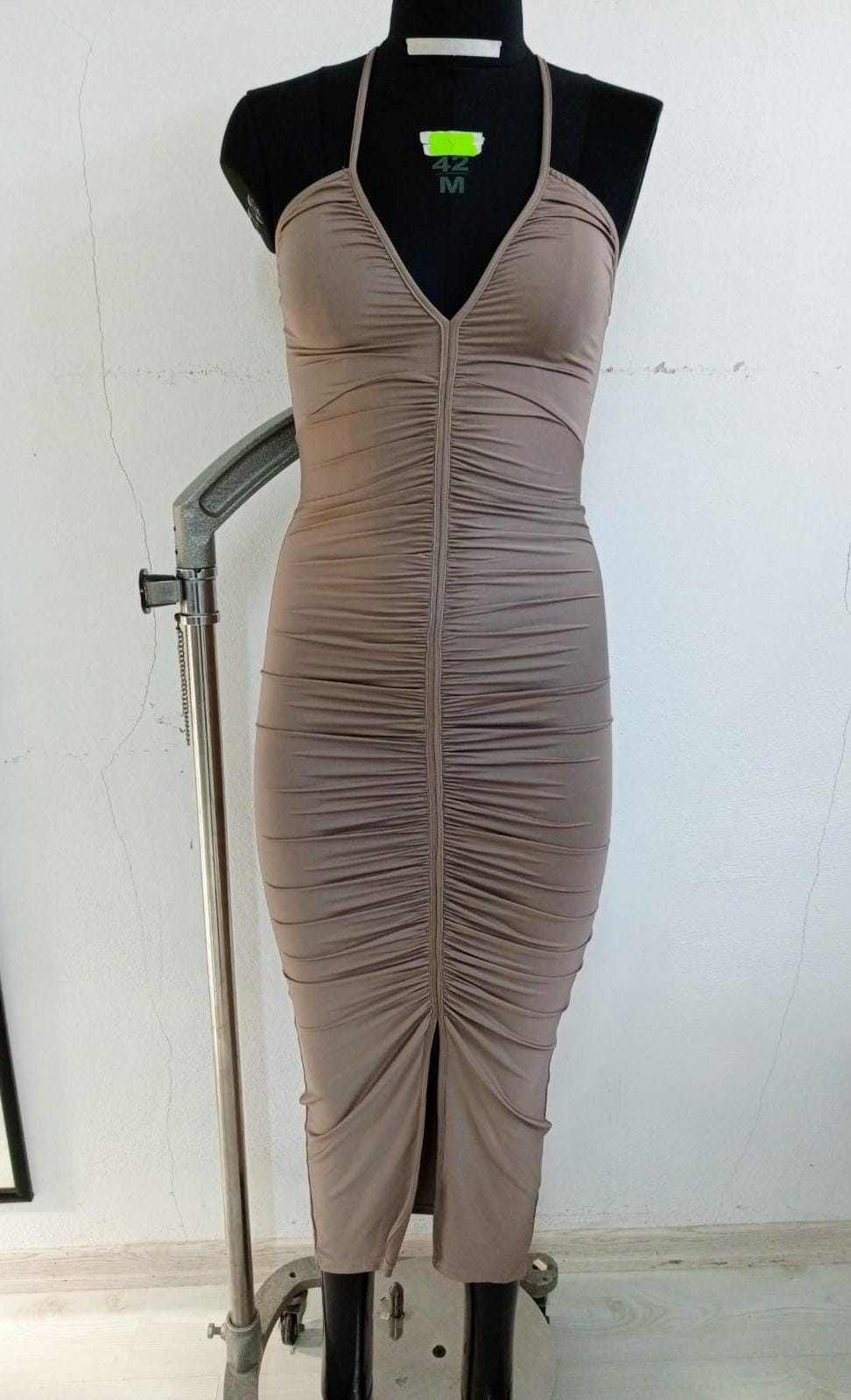 Premium Vücuda Oturan Örme Büzgülü Özel Dekolte Detaylı Abiye Elbise - kahve